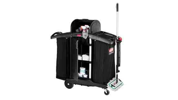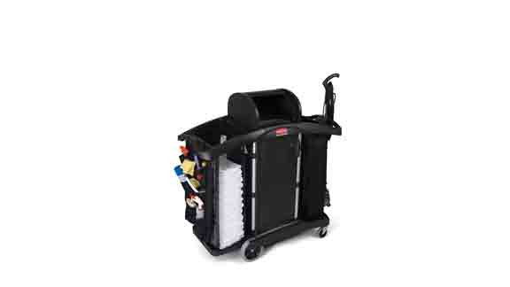 - Un vaste espace de stockage avec des bacs et des caddies en option permettent au personnel de se réapprovisionner avant de nettoyer, augmentant ainsi la productivité en éliminant le temps de recherche de fournitures supplémentaires.