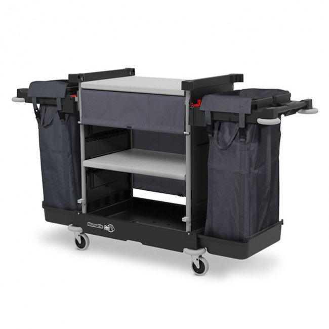 Ce chariot hôtelier est équipé d'une large étagère double et de deux supports sacs à linge 100L gris.