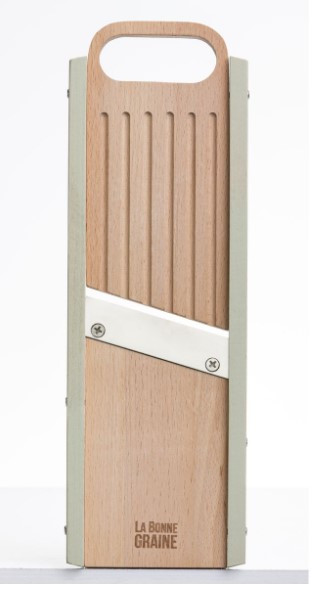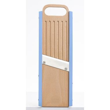 Mandoline professionnelle de cuisine en bois prévue pour découper les légumes en tranches et rondelles avec grande précision.