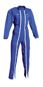 La combinaison de travail possède une double fermeture avec des glissières blanches.