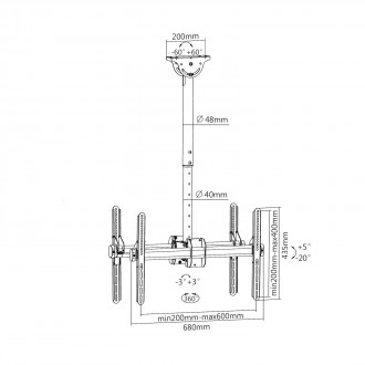 - Hauteur des écrans ajustable (distance plafond / centre téléviseurs) : de 106 cm à 156 cm.