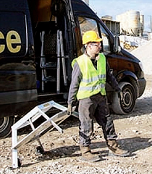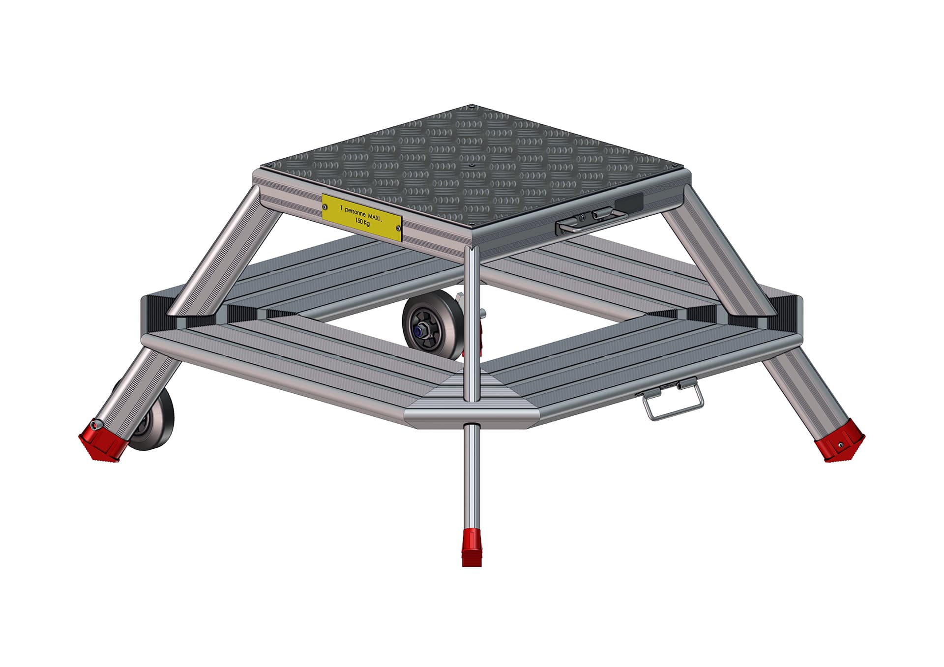 Sa plateforme en aluminium strié assure une excellente stabilité, tandis que les marches antidérapantes garantissent une sécurité optimale pour l'opérateur.
