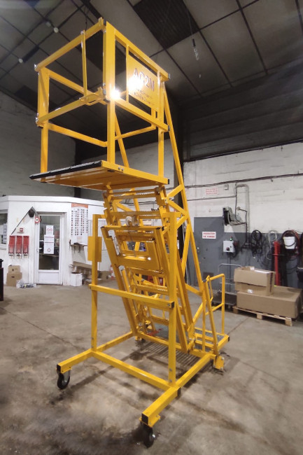La structure est en acier tandis que l'échelle est en aluminium. Deux rampes placées de chaque côté de l'échelle sécurisent la montée tandis qu'une cage de sécurité sur la plateforme assure la protection de l’opérateur durant son intervention sur le haut du conteneur.