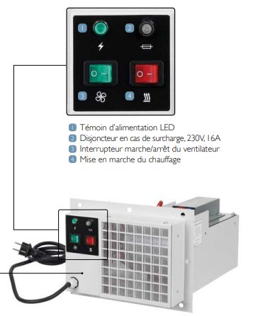 L’utilisateur dispose d’un interrupteur marche/arrêt pour le ventilateur et d’un interrupteur spécifique pour la mise en route du chauffage, ce qui permet d’adapter le fonctionnement selon la saison ou le type de textiles à sécher.