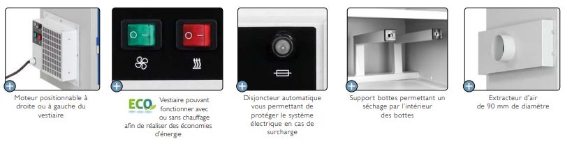 Le vestiaire séchant chauffant intègre une prise électrique dédiée au branchement d’un module de désinfection et de purification d’air en option.