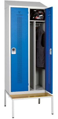 Chaque vestiaire séchant en acier dispose d’une étagère haute, d’une cloison de séparation avec tringles PVC et d’un socle-banc à assise en bois massif verni, pensé pour faciliter l’habillage et le rangement.