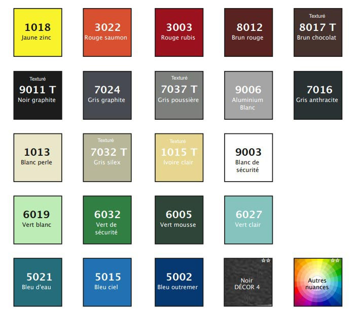 Gris graphite (RAL 7024) Gris poussière (RAL 7037 texturé) Aluminium blanc (RAL 9006) Blanc perle (RAL 1013) Vert mousse (RAL 6005) Autre à préciser au panier - Voir nuancier PDF