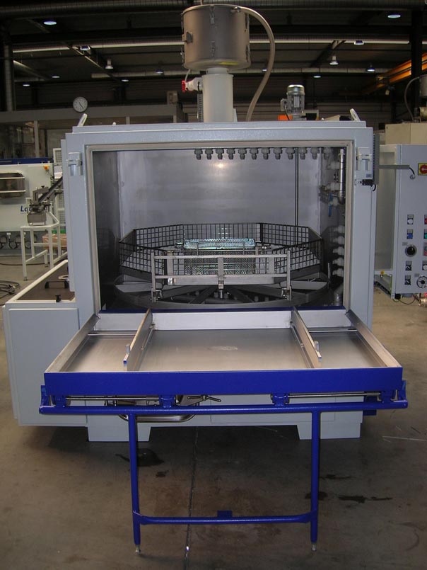 - Cabine en acier normal ou en acier inoxydable dans laquelle se trouve un plateau rotatif, commandé par un jet d’eau ou un moteur