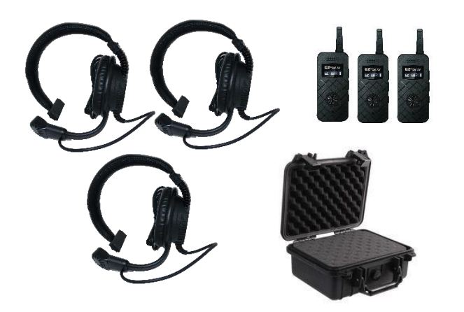 L’ensemble est fournit sous forme de kit composé d’un système de communication, de micro-casques monaural professionnel, d’un chargeur multiple et d’une valise de rangement étanche.