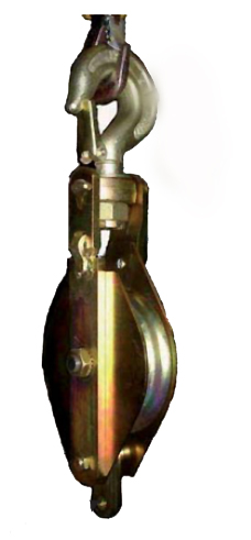 Poulie de levage avec crochet, spécialement étudiée pour être utilisée avec le câble des appareils de traction.