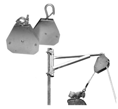 Poulie de levage manuel par corde pour chantier qui permet de lever des charges de 50 kg (corde comprise), pour des hauteurs de levage maximales de 30 mètres .