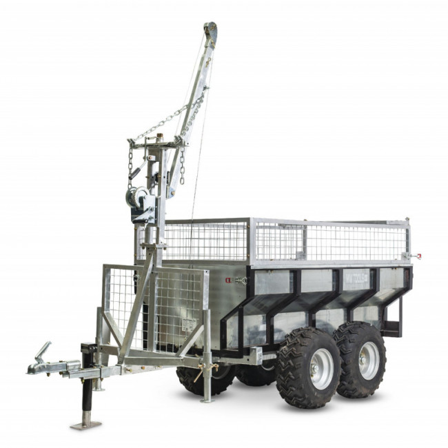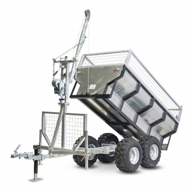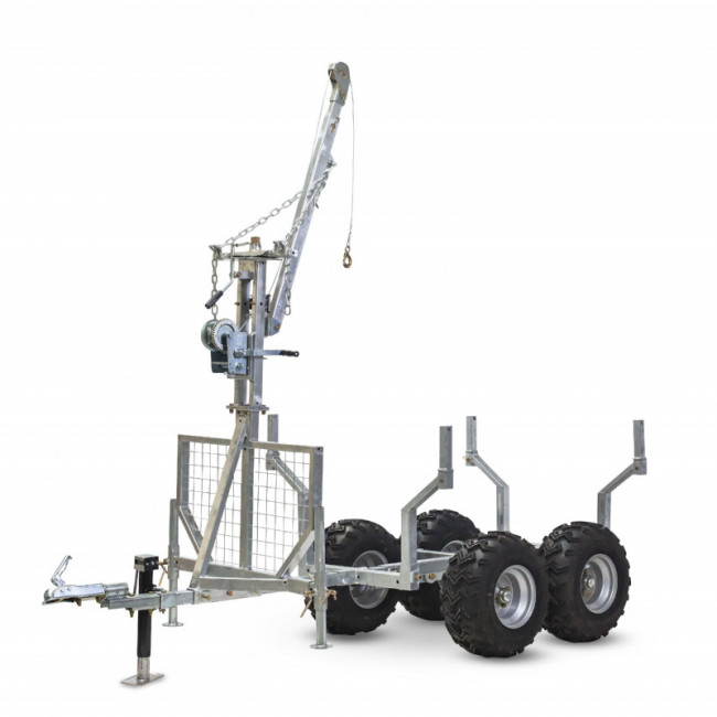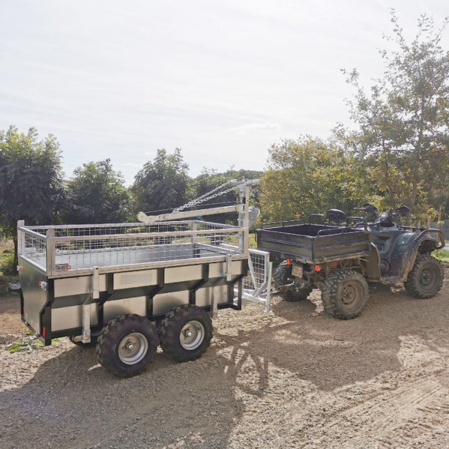 C'est une remorque benne et grue pour transporter le bois permettant de supporter une charge allant jusqu'à 1000 kg.