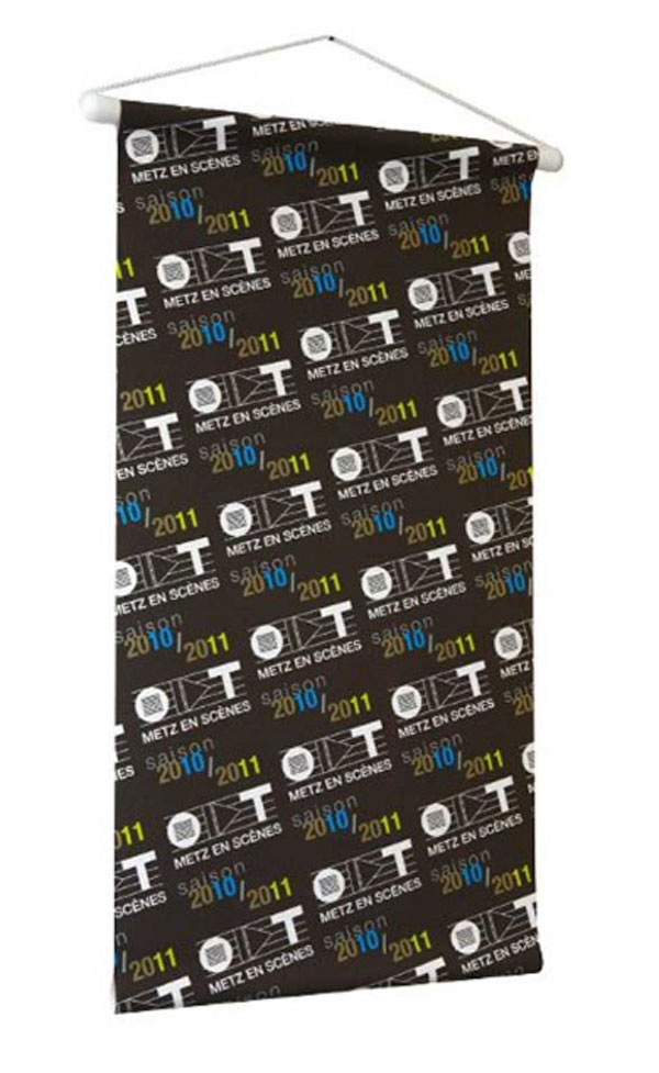 - Kakemono personnalisé avec tourillon bois (possible aussi en aluminium) haut et bas.
