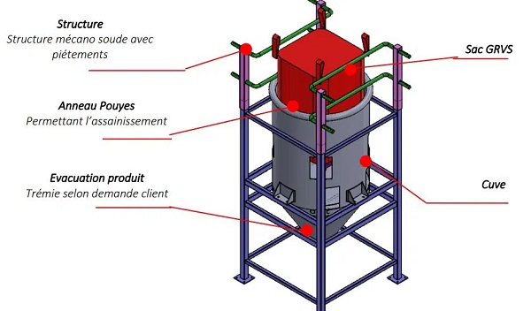 Doté d'un système d'assainissement, notamment l'anneau Pouyes, ce poste de vidange big bag contribue à protéger l'environnement de travail.