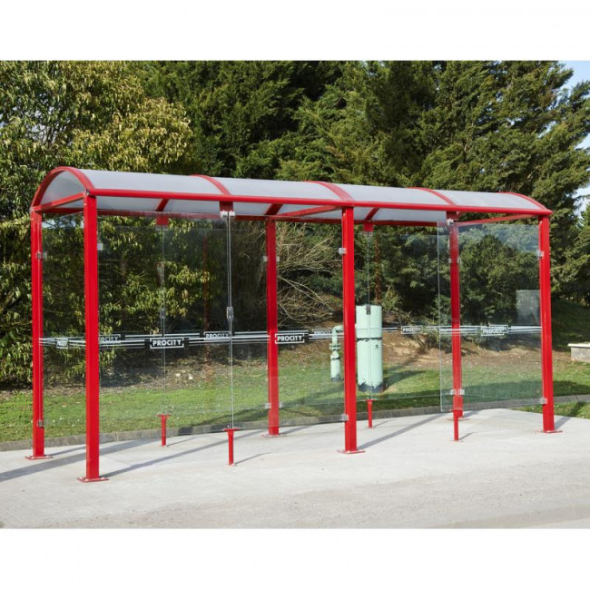Bardages de façade, de côtés et de fond en verre sécurisé de 8 mm d’épaisseur avec signalétique de sécurité. Fixation par système de pincement pour un remplacement aisé en cas de vandalisme.
