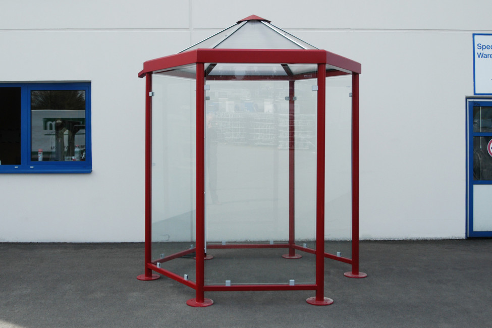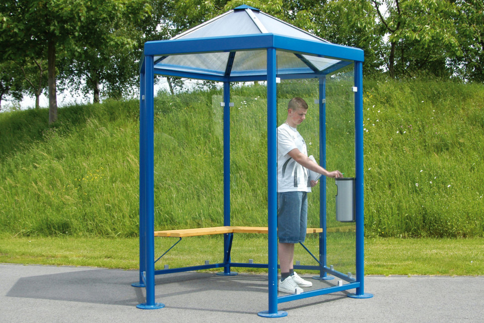 Cet abri fumeur hexagonal permet aux personnes de fumer à l'extérieur en se protégeant de la neige et du soleil.