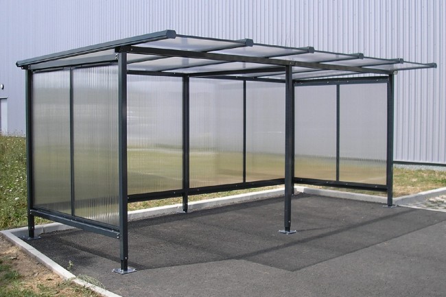 C'est un abri pour fumeur avec un toit plat avec une pente arrière 5% conçus avec des poteaux métalliques (tubes carrés) traités anti-corrosion.
