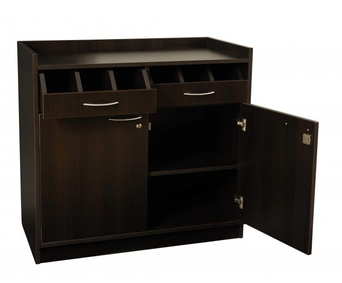 Fabriquée en bois stratifié, garantissant sa résistance , dispose de 2 portes battantes et 2 tiroirs à couverts plein ou semi-ouverts.