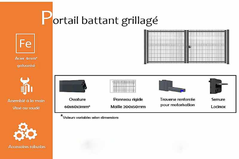 Avec des options de largeur et de hauteur, ce portail s'ajuste aux besoins spécifiques de chaque installation. Des configurations comme les avantages inégaux ou l'ouverture sur pente permettent une mise en place sur mesure.