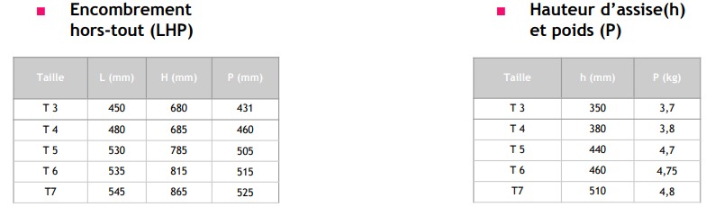 (Taille T3) : L: 450 mm / H: 680 mm / P: 431 mm (Taille T4) : L: 480 mm / H: 685 mm / P: 460 mm (Taille T5) : L: 530 mm / H: 785 mm / P: 505 mm (Taille T6) : L: 535 mm / H: 815 mm / P: 515 mm (Taille T7) : L: 545 mm / H: 865 mm / P: 525 mm