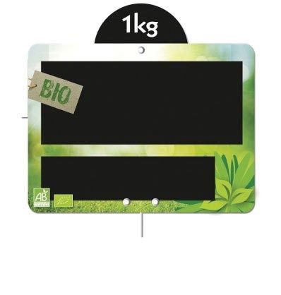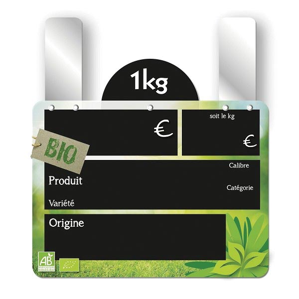 Disponible en version neutre ou VOCC, vous pourrez y inscrire la description, l’origine, la variété, le prix et le poids de vos fruits et légumes.