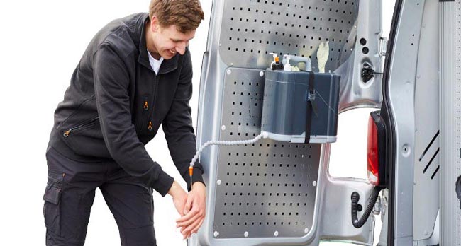Ce lave mains pour véhicule utilitaire permet à l’utilisateur de se laver les mains où et quand il le souhaite.