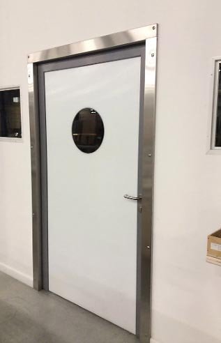 renfort arrière par U inox, joint anti pince doigts souple aux bords arrondis, hublots diamètre 350 mm en PMMA épaisseur 15 mm bi affleurant, charnières va et vient en DERLIN avec mécanisme tout inox avec ou sans système de blocage à 90° huisserie en inox 304L en U ou en C, Protection basse en inox ou PEHD, par plaque ou aile d"avion