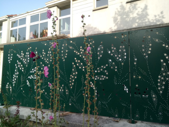 Les panneaux perforés au motif végétal vert donne une dynamique continue sur le linéaire de clôture qui serpente le trottoir de la ville.