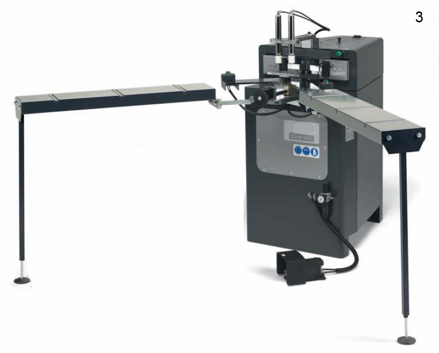 Modèle 1 (Voir photo 1) : - Sertissage chambres extérieures. - Il faut régler seulement la hauteur du plan support ouvrant. - Commande bi-manuel. - N.6 butées enregistrables. - Prédisposition pour la fixation.