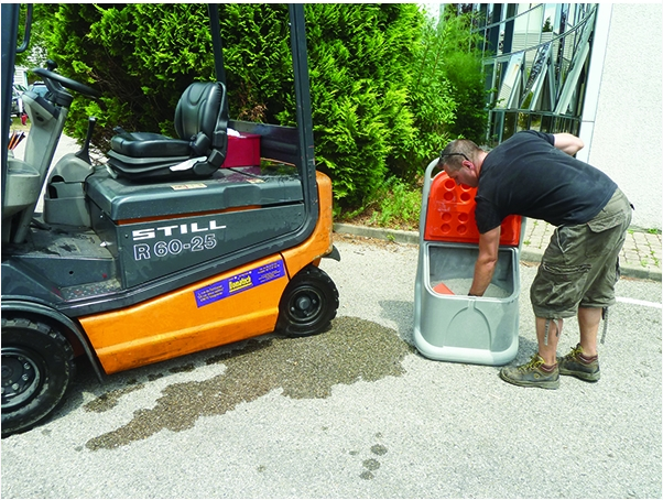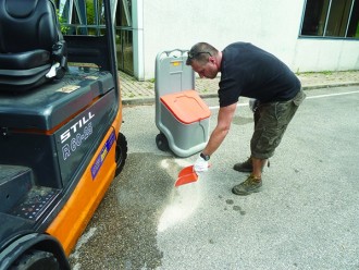Ce coffre à absorbant mobile est doté d’un couvercle incliné pour l’évacuation des eaux pluviales.