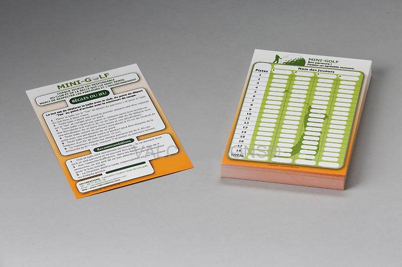 Il s'agit d'une fiche de score pour mini golf en couleur avec la règle du jeu au verso.