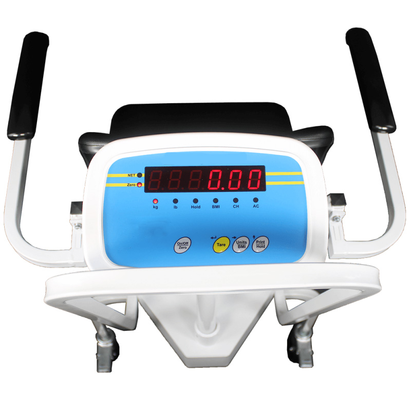 Ce fauteuil pèse personne est une balance de fitness qui affiche l’indice de masse corporelle.