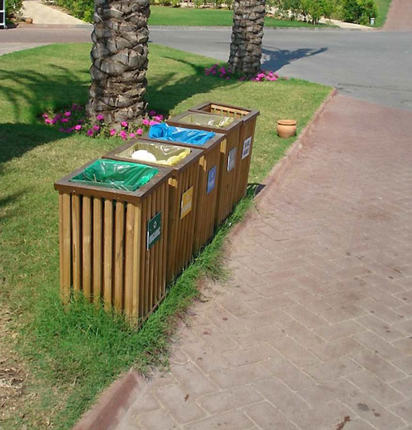 L’entourage en bois, les couvercles colorés et ainsi les étiquettes indiquant les déchets à recevoir, attirent l’attention des passagers et permettent à ces poubelles de s’adapter à tout espace extérieur.
