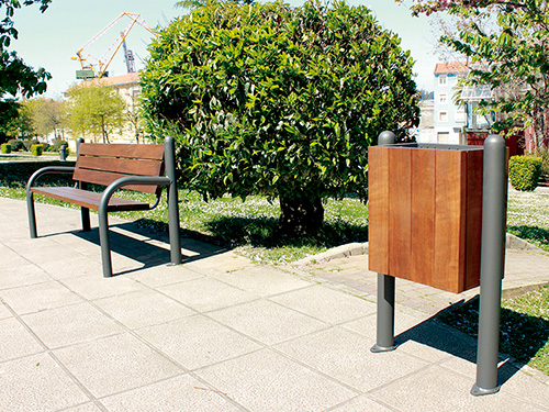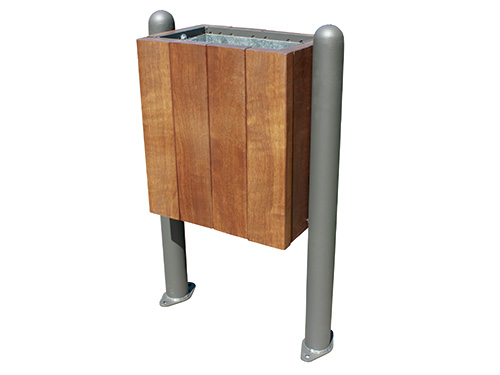 Cette poubelle urbaine est fabriquée avec du bois tropical et tôle, en acier zinqué.
