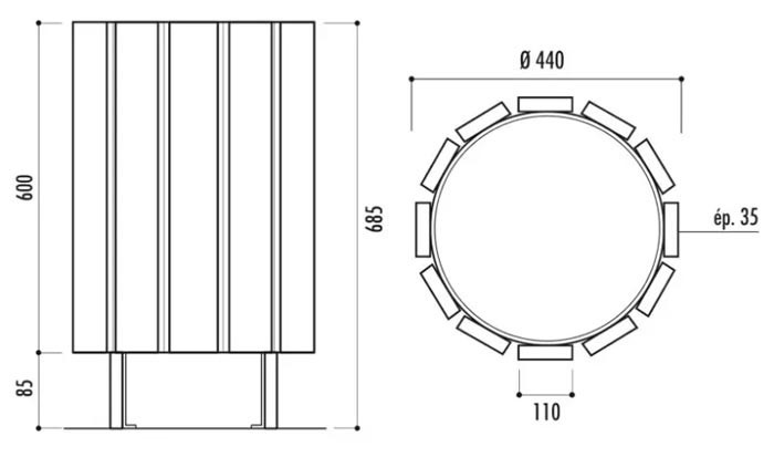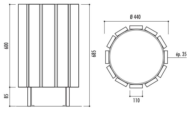 Capacité : 48 L Dimensions : H.685 x Ø 440 mm Lames pin traité autoclave ou exotique Certifiées FSC À sceller