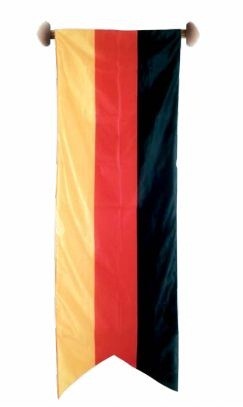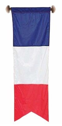 Cette oriflamme est composée avec traverse bois prise sous fourreau terminée par boules bois teintées et vernies, et cordelière pour suspension.