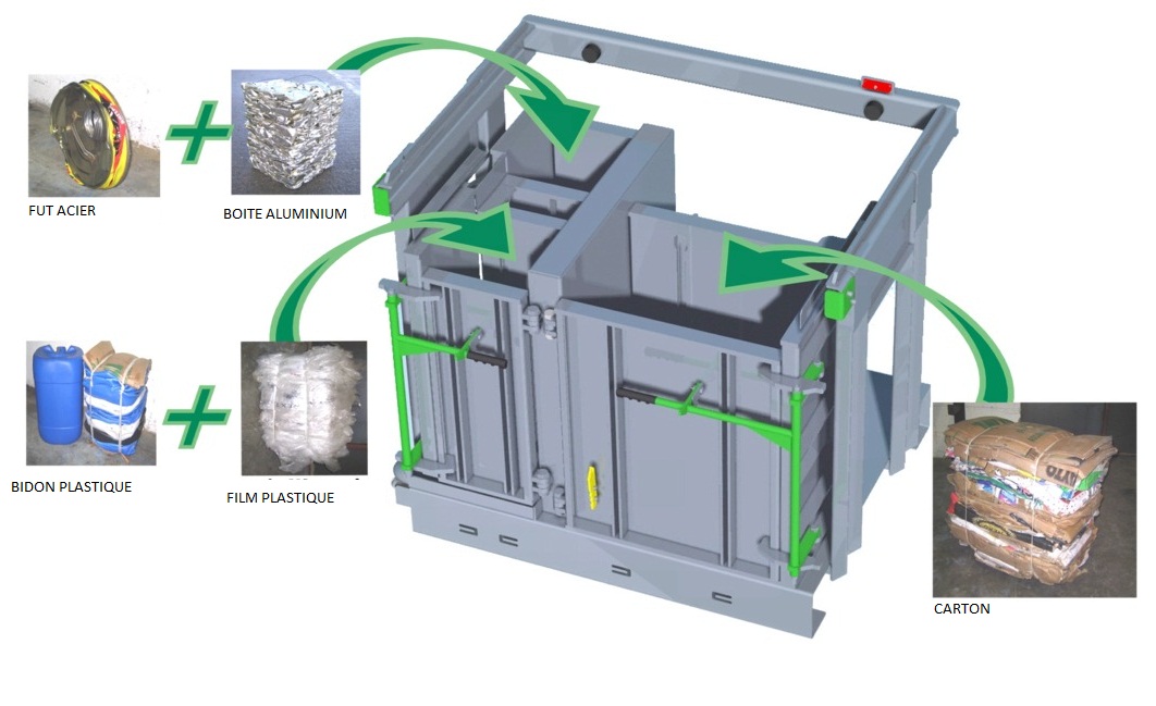 La presse à balles triple caissons ultra compacte et 3 en 1 permet de gérer trois matières différentes carton, plastique, métal. Elle est idéale pour réaliser le tri des déchets à la source et prend le même espace au sol qu’une palette.