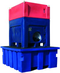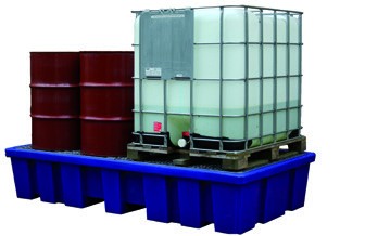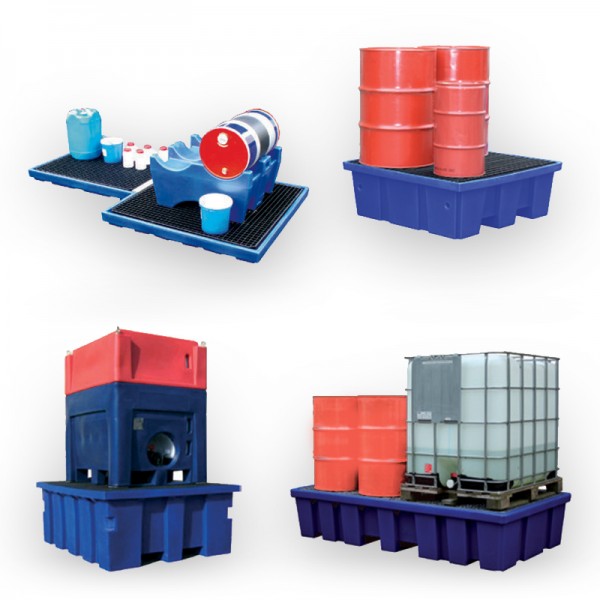 PEHD rotomoulé et traité anti UV, avec ou sans caillebotis, elles peuvent contenir 4 ou 8 fûts ou contenants conformément à la législation européenne.