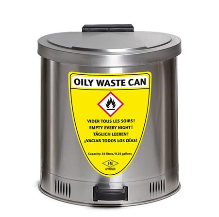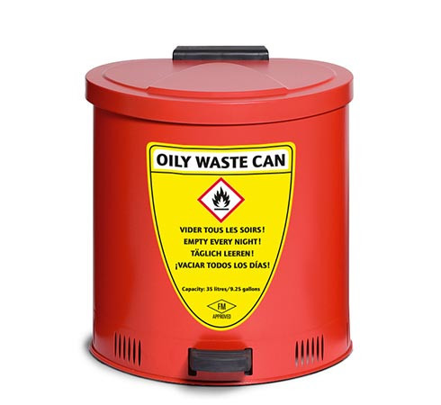 Cette poubelle anti feu en tôle d’acier permet l’élimination sécurisée des chiffons tâchés d’huiles et d’autres déchets inflammables.