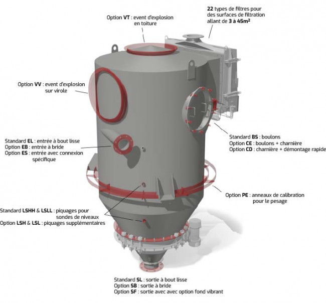 ‐Conception en fonction des paramètres ATEX du produit (Pred : Pression résiduelle d’explosion = 0,49 bar en standard, autre selon demande)
