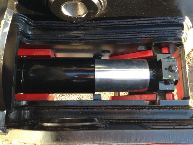 Sa double sécurité se décline d'une part en une crosse avant en prise sur l'axe balancier du godet, d'autre part en un gros ressort entourant le vérin et protégé dans un fût pour les pelles à partir de 10 tonnes.