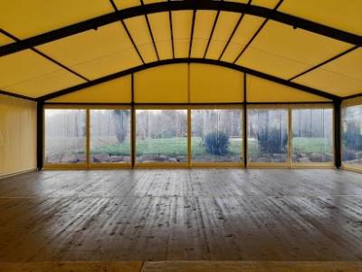 Baies vitrées et bâches translucides : Permettent de laisser entrer la lumière naturelle, ajoutant une touche d’ambiance lumineuse.