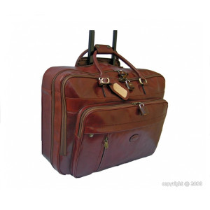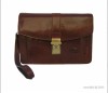 Sacoche en cuir de couleur marron, fermée par un rabat doté d'une serrure à fermeture à clé et disposant d'une poche à l'arrière fermant par zip et d'une poignée pour le transport.
