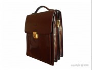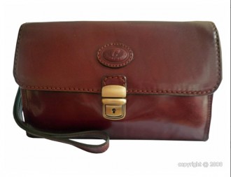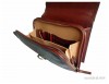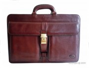 Sacoche en cuir de couleur fauve, fermée par un rabat doté d'une serrure à fermeture à clé et disposant d'une poche à l'arrière fermant par zip et d'une poignée pour le transport.