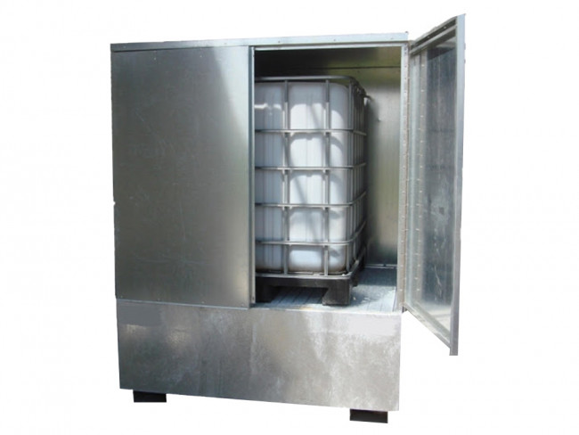 - Bac de rétention en acier galvanisé, muni d'un carénage complet avec portes et serrure. - Capacité de rétention : 1000 Litres - Dim extérieures (L x P x H) : 1500 x 1380 x 1940 mm - Dimensions intérieures (L x P x H) : 1440 x 1288 x 1283 mm - Poids : 430 kg - Livré monté