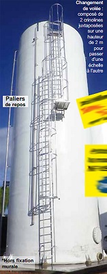 Une échelle à crinoline avec changement de volées de 26 m de hauteur : 1ère partie: hauteur de 20ml à gravir avec changement de volées tous les 4m, 4 paliers de changement de volées, 2 paliers rabattables côté gaine. - 2ème partie: hauteur de 6,5ml à gravir avec 1 palier de départ de 1x1,50ml, 1 palier intermédiaire de 1x0,80 ml, 1 palier d"arrivée de 1x3,40ml et échelle 2 plans à crochets, ligne de vie verticale. fourniture et en option la pose.