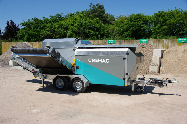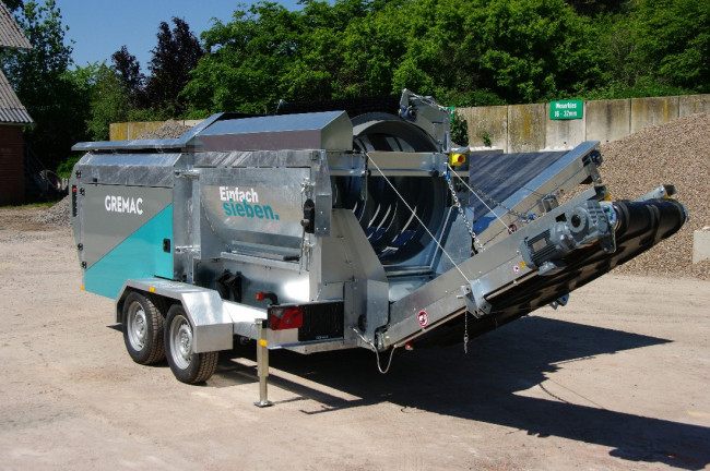 Le cribleur à tambour sur remorque Gremac e1 est conçu pour le tamisage de compost, de biomasse, de terre végétale, de gravier, de gravats, de DIB broyés, de plaquettes forestières, etc … Il se décline aussi en version sur chenilles, en version sur berce et en version fixe électrique. Ce crible bénéficie de la haute qualité de fabrication allemande GREMAC, en effet il est construit avec des matériaux de très haute qualité et il possède de nombreuses parties en acier galvanisé à chaud garantissant une durée de vie accrue.