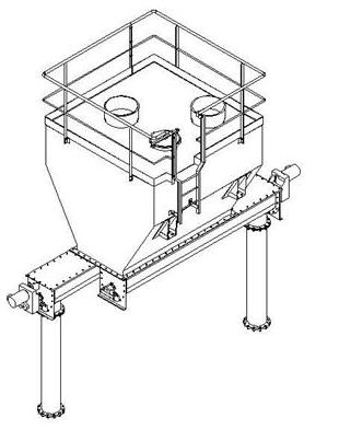 Trémie tampon 40m3 destinée à recevoir de la boue de pâte à papier et pouvoir assurer le chargement de bennes de 10m3 par dessous. Dimension 6000x4000 hauteur sous trémie 2600