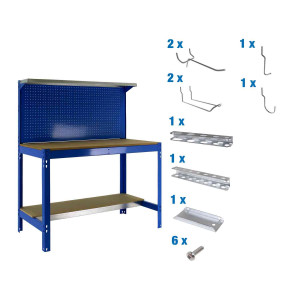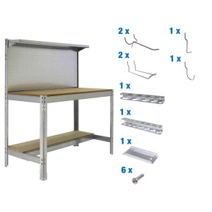 Cet établi sans vis avec accessoires comprend 3 étagères et un panneau perforé pour ranger les outils.