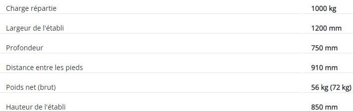 Avec une capacité impressionnante pouvant supporter jusqu'à 1000 kg de charge répartie, cet établi est l'outil idéal pour les tâches nécessitant une résistance et une stabilité exceptionnelles.